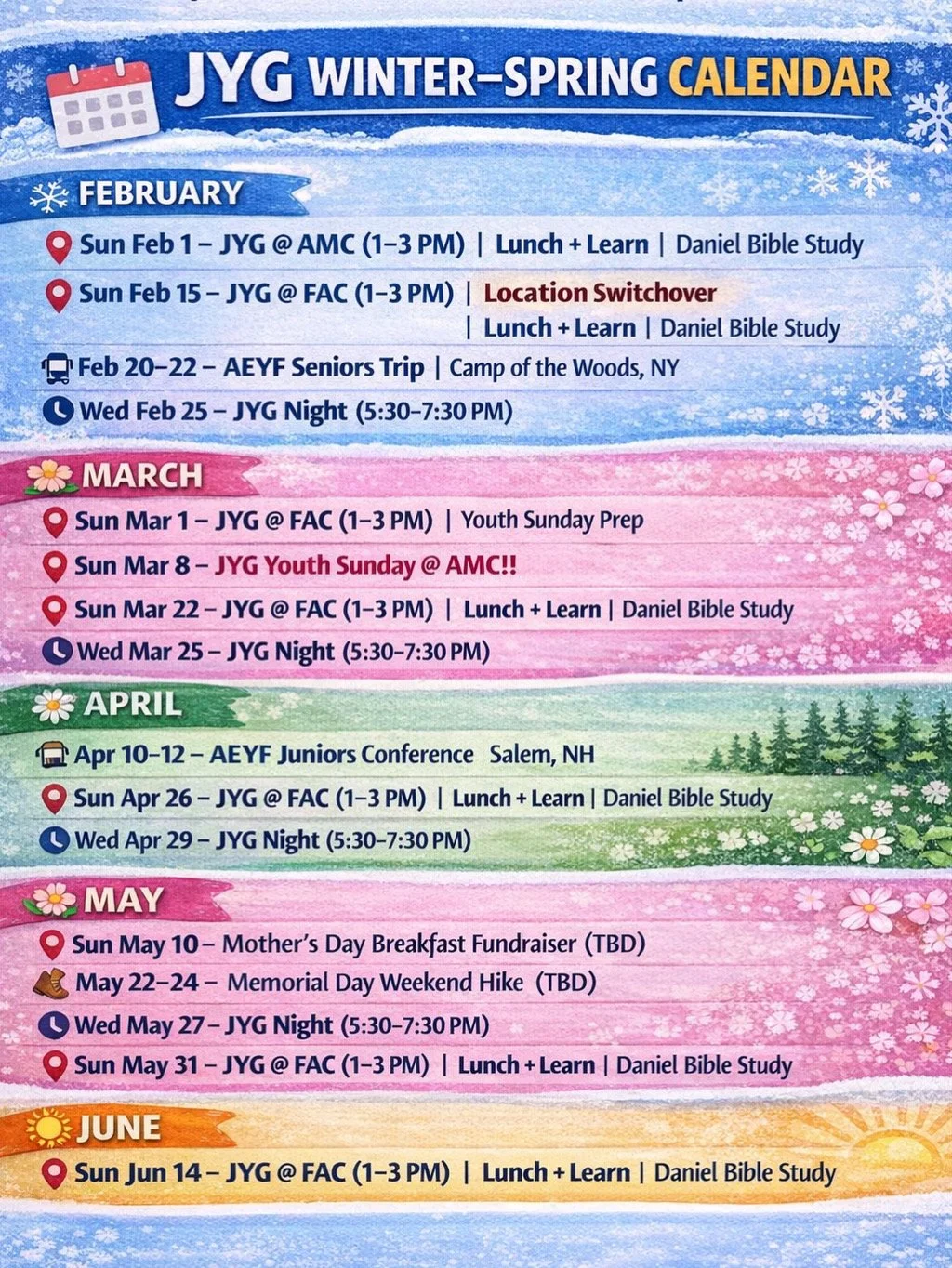 The Joint Youth Group Leader is James Boyadjian, who has served the youth for the past two years. For questions about the youth group or to be added to the email list, please email James.Boyadjian@gmail.com. If you have questions about your faith or are interested in learning more about God, our Youth Group has answers and opportunities for you to explore. We would love to have you there!