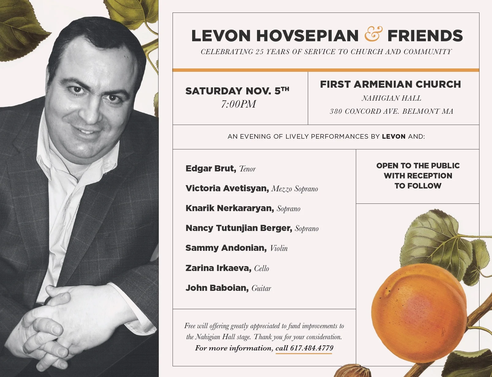 A commemorative concert held on Saturday, November 5 in the Nahigian Fellowship Hall honored Levon Hovsepian’s twenty-five years of service to First Armenian Church and the Greater Boston Community.